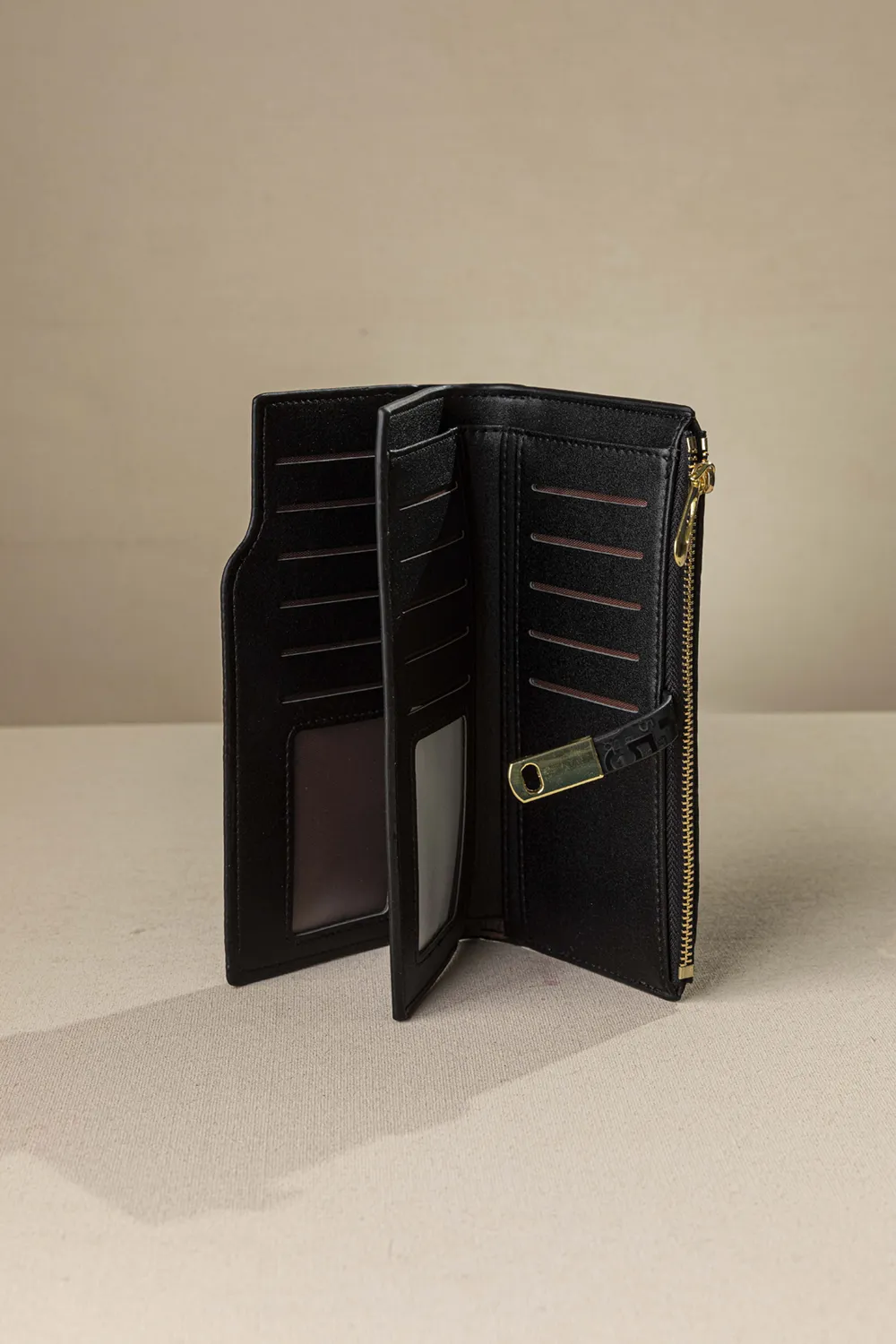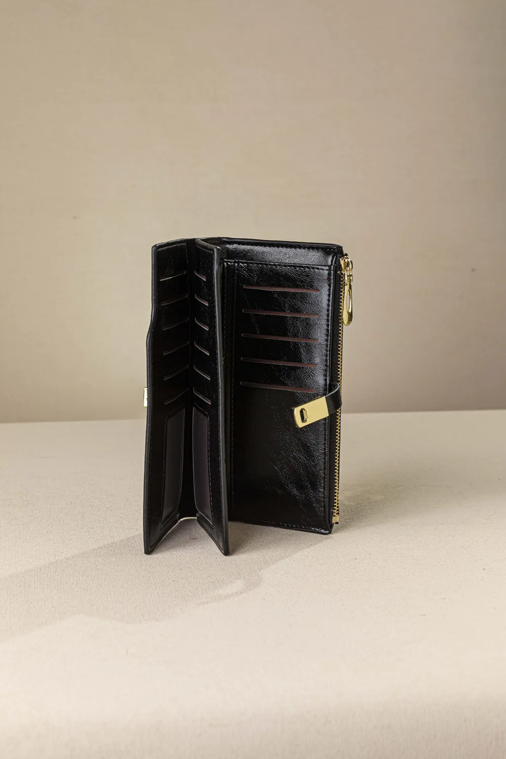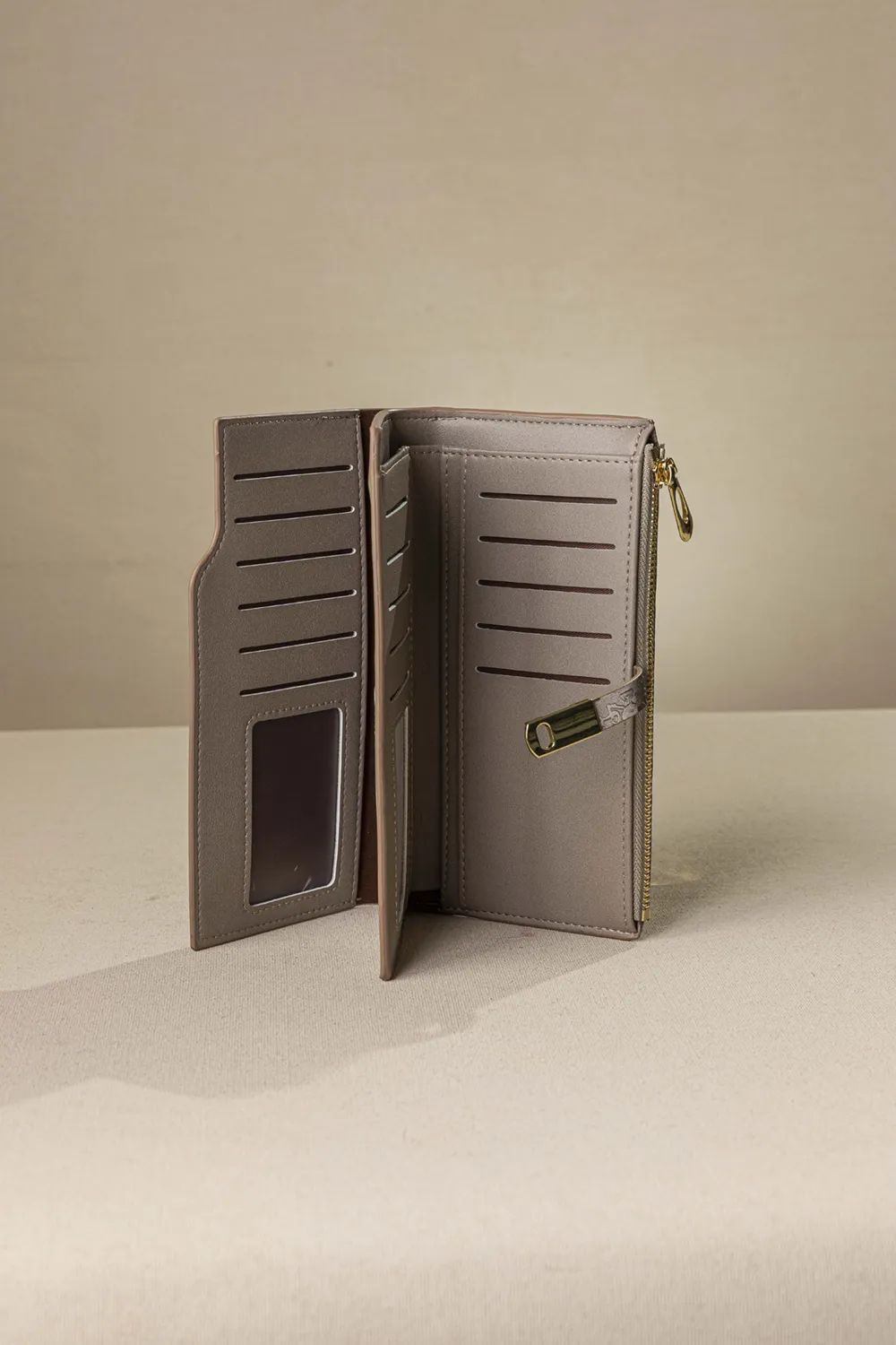 Μεγάλο πορτοφόλι που κλείνει με καπάκι με μαγνητικό μπουτόν. Διαθέτε πολλές θήκες για κάρτες και μεγάλη θήκη για χαρτονομίσματα. Εξωτερική θήκη με φερμουάρ για τα ψιλά με διαχωριστικό με έξτρα θήκη με φερμουάρ. Υλικό: Συνθετικό δέρμα με μαλακή υφή.